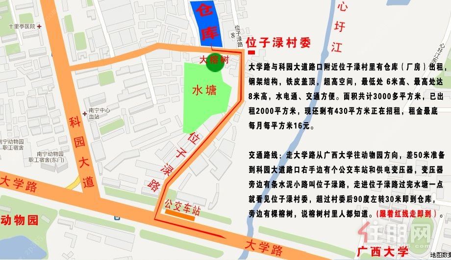 西乡塘区大学路与科园大道路口附近的位子渌社区,(在位子渌社区居委会旁)有空厂房(仓库)出租。彩钢铁皮盖顶,钢架结构,厂房顶***高处8米高,滴水线***低处6米高,周边全是硬化道路,通方便、水电到位。一间面积为430平米,另有一间为500平米,每月每平方米租金***底为16元。 交通路线:从市中心沿着大学路往动物园方向走,准备走到科园大道路口(还差约50米到科园大道路口),右手边有个公交车站(叫“大学路与科园大道路口”的站点),这个公交车站旁边有条水泥小路叫位子渌路,走进位子渌路约100米右手边就看见位子渌社区居委会,超过社区居委会马上90度左转走30米下坡即到仓库,仓库门前有棵榕树。